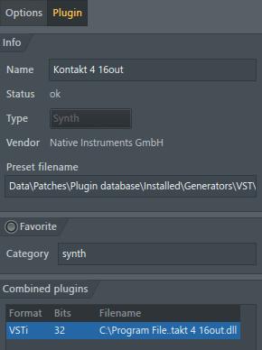 • Combine 32 and 64 bit versions of a plugin (объединение 32 и 64 битных версий плагинов) - создание одного пресета плагина, для плагинов который имеют как 32-битную так и 64-битную версии. FL будет использовать опцию 'Bit size' в оболочке, чтобы определить, какая версия открыта.