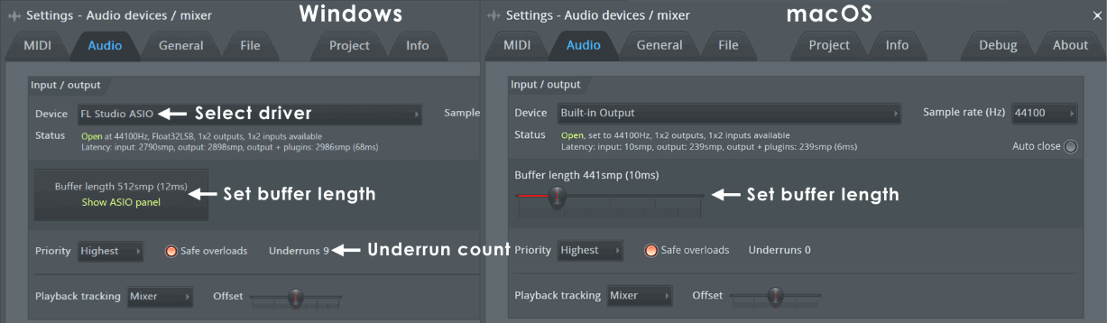 Если использование вашего процессора или диска поднимается слишком высоко, вы услышите щелчки в звуке (переполнение буфера). Хорошая новость в том, что использование процессора и диска обычно может быть значительно снижено, если у вас есть время, чтобы внести некоторые коррективы в звуковые настройки FL Studio. Почему это происходит? Аудио-буфер сохраняет аудиоданные перед их отправкой на аудиоустройство. Это позволяет FL Studio выравнивать кратковременные всплески нагрузки на процессор, когда обработка может быть медленнее, чем «в режиме реального времени». Если звуковой буфер иссякает, потому что ваш процессор или жёсткий диск не могут успевать за звуковым потоком "в реальном времени", то ваша звуковая карта издает щелчки или заикания. Стоит отметить, что опустошения могут происходить только при воспроизведении в режиме реального времени, они не происходят при экспорте в wav или mp3 файл. Если вы слышите подобное в экспортированном звуковом файле, то вполне вероятно, какой то из плагинов ведёт себя плохо, в этом случае проверьте настройки плагинов.