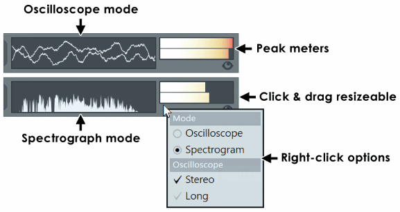 • Spectrograph (спектрограф) - показывает частотный спектр выхода из FL Studio. Низкие частоты слева, высокие частоты справа. Примечание: Выход масштабирован таким образом, что розовый шум имеет плоский спектр. Розовый шум имеет равную силу в каждой октаве. Считается, что сведение по такому принципу даёт "сбалансированный" микс.