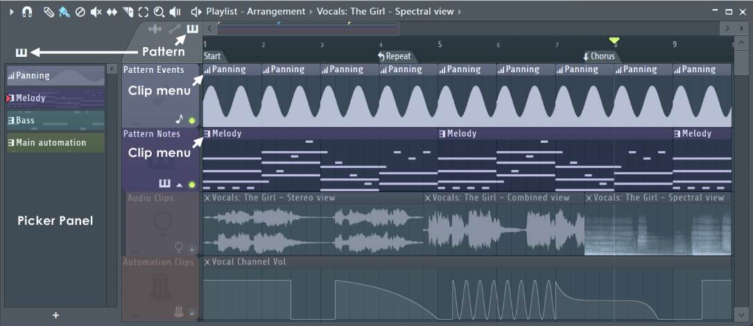 Паттерн клипы могут быть организованы таким же образом, как аудио клипы и клипы автоматизации. Эти методы обсуждаются в основном разделе плейлиста.