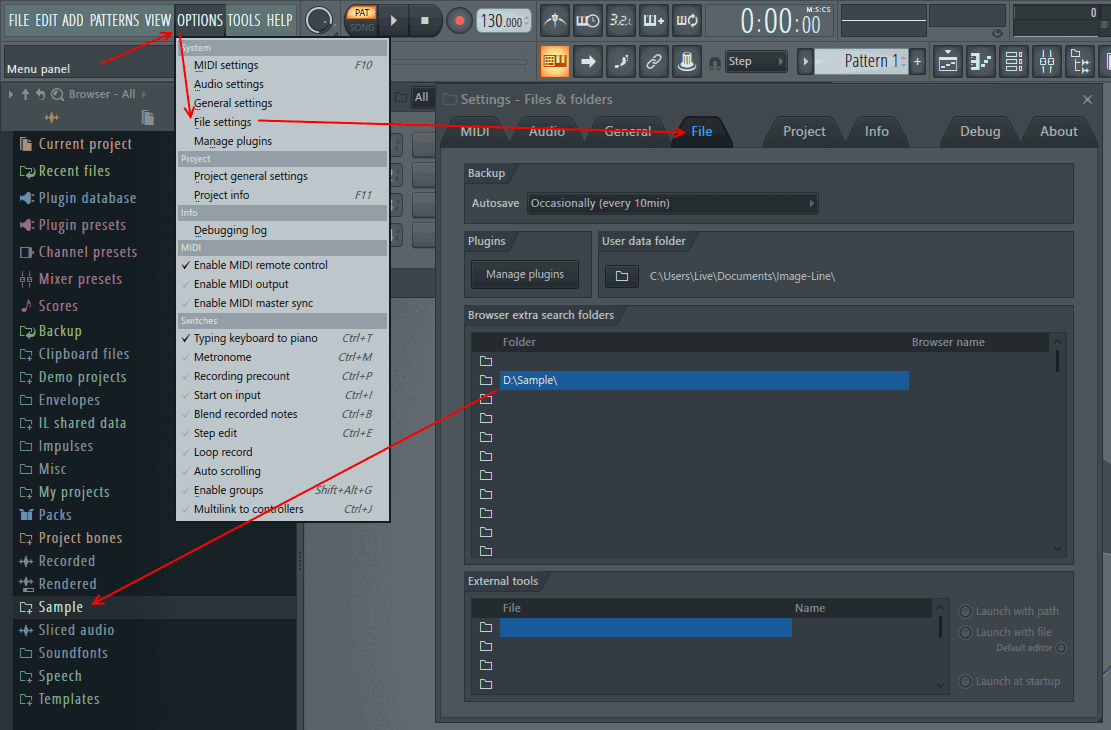 Если вы хотите воспользоваться сторонними сэмплами скачанными из интернета или теми которые у вас уже есть, то для этого вам нужно прописать путь к ним в настройках программы. Для этого выберите File settings из меню OPTIONS (см. картинку ниже). Далее в появившемся окне нажмите по любому изображению папки как указано на рисунке, после чего укажите место где у вас хранятся сэмплы (в нашем примере это D:\Semple). В итоге в браузере появится ваша папка с сэмплами помеченная зелёным цветом, внимательно посмотрите и найдите её!