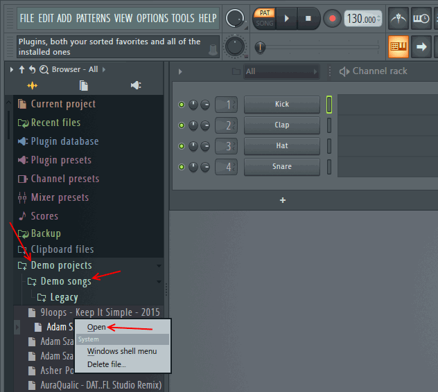 Если вы хотите послушать возможности программы перед началом работы в ней, то откройте браузер как на картинке ниже (если вы не видите браузер нажмите Alt+F8 или Option+F8 на клавиатуре). Здесь представлены демо проекты. Нажмите по проекту правой кнопкой мыши и выберите Open (открыть). Клавиша пробел запускает воспроизведение.