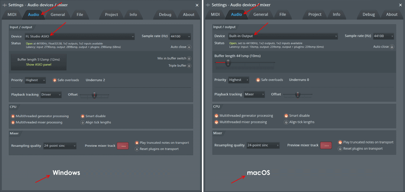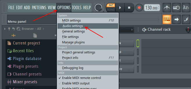 - Windows - выбрать звуковой драйвер FL Studio ASIO (если он не выбран).