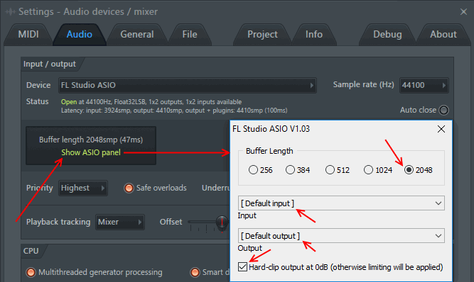 - Buffer Length (размера буфера) - задаёт размер буфера драйвера, не будем вдаваться в подробности, как он работает (в этом нет необходимости). Заметим лишь то, что чем больше размер буфера, тем легче компьютер будет справляться с нагрузкой; чем меньше значение - тем больше нагрузка (треск). Также, чем больше размер буфера - тем больше задержка отклика программы на ваши действия, и больше задержка отображения событий. Проще говоря, можете поставить значение на максимум (2048), изменений вы почти не заметите, зато разгрузите процессор своего компьютера.