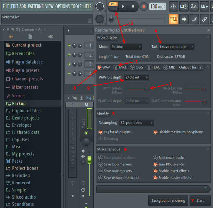 Если вы закончили работу и хотите дать послушать вашу музыку друзьям, которые даже не знают о существовании FL Studio, то вам необходимо выбрать формат *.mp3 или *.wav. При выборе этих форматов из меню тип файла (см. 1 на картинке выше), после нажатия кнопки Сохранить у вас появится диалоговое окно рендеринга (см. картинку ниже).