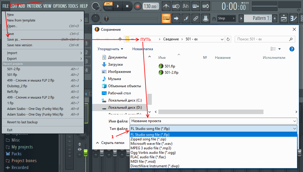 В этом разделе давайте рассмотрим как правильно сохранять ваш проект, для того чтобы вы могли продолжить работу, заархивировать проект, или дать его кому-нибудь послушать. Для сохранения проекта откройте меню File (см. картинку ниже), далее выберите Save as.... В появившемся окне укажите путь, куда вы хотите сохранить ваш проект/аудиофайл, введите желаемое название. Далее обратите внимание на тип файла (1 на картинке ниже), здесь вы выбираете как будет сохранен ваш проект, мы с вами рассмотрим самые необходимые форматы (описание вариантов см. ниже).