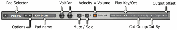 • CUT Group/Cut BY - использование CUT и BY, приводит к тому, что звучание одного пэда (BY) прерывается звучанием другого (CUT). Раздел CUT устанавливает срезающую группу выбранного пэда. Второй раздел BY, устанавливает какая группа срезает текущий пэд. Используйте эти средства управления, чтобы сделать более реалистичные наборы ударных, например где открытый hi-hat срезается закрытым. Для того, чтобы пэд срезал сам себя, установите значения CUT и BY в одинаковые значения. Чтобы изменить значение, щёлкните левой кнопкой мыши по полю, и удерживая перемещайте мышь вверх и вниз.