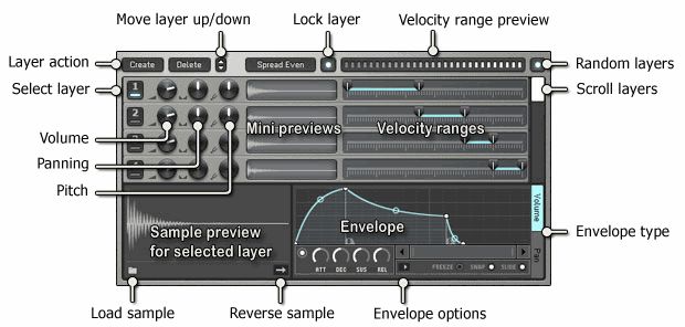 - Как правило, функция Random предназначена для выбора из ряда воспроизводимых сэмплов на одинаковой велосити, с тонкими и природными различиями между ними, вызванных человеческой неточностью или перемещением руки влево/вправо. Рандомизация слоёв исключает искусственный и механический звук часто связанный с использованием одного сэмпла при быстром проигрывании. Однако вы можете найти, что за счёт выравнивания громкостей нескольких слоёв (с помощью ручки Layer Volume), естественная игра может быть "фальшивой" в результате использования всего несколько слоёв сэмпла.