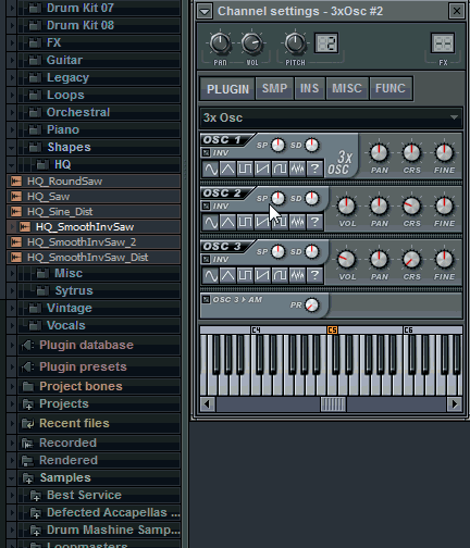 • Поскольку синтезатор 3xOsc работает как дополнение к стандартному встроенному Sampler-у, как правило недостаточно сохранить пресет, нужно сохранить полный 3xOsc пресет инструмента, который содержат полный звук синтезатора. В результате, 3xOsc пресеты по умолчанию можно будет найти в браузере /Channel presets/3x Osc/.