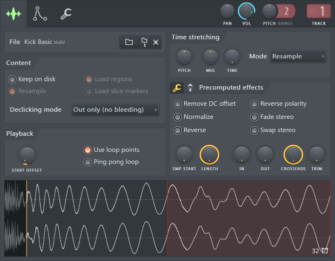 Графический дисплей в самом низу окна показывает загруженный сэмпл (со всеми примененными к нему эффектами). Информация и значки, в нижней правой части показывают битность (например 16-Bit, 32-Bit) и стерео конфигурацию (: например моно, стерео), соответственно. Примечание: MP3, OGG, WV и 24 битные исходные сэмплы при загрузке преобразуется в 32 битные, так что не используйте их для определения формата исходного сэмпла. Проверьте в браузере Windows.