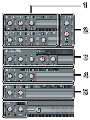 - Огибающая - применяется огибающая для фильтра и уровня TS404. Огибающая ведёт себя так же, как стандартная огибающая ADSR, с некоторыми дополнительными свойствами (сустейн удержание и гейт).