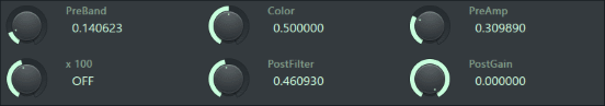 - PreAmp (предусиление) - перегружает звук в целях достижения искажений. По мере увеличения параметра PreAmp, его необходимо компенсировать с помощью ручки PostGain.