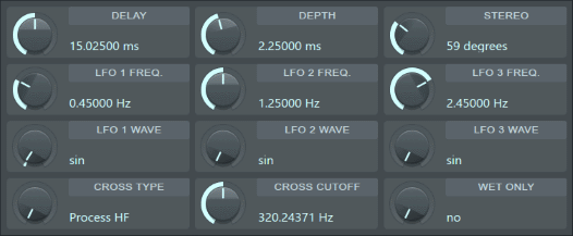 Fruity Chorus это эксклюзивный плагин FL Studio разработанный Smart Electronix. Хорус это эффект создающий небольшую расстройку одной или нескольких задержанных копий входящего звука (по аналогии с голосами хора). Элементы управления содержат параметры, которые влияют на скорость, смещение времени, форму и глубину расстройки.