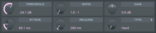- Gain (усиление) - управляет велечиной усиления, чтобы усилить или уменьшуть сжатый выходящий сигнал. Диапазон: от 30.0 до -30.0 дБ. Gain должен быть настроен для нормализации амплитуды сигнала после сжатия или для управления количеством лимитирования.