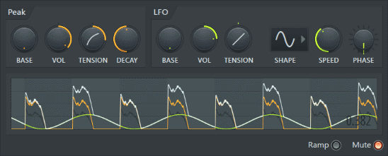 1. Удерживайте нажатой кнопку мыши на параметре Vol в разделе Peak или LFO, чтобы увидеть их огибающие в изоляции. 2. Fruity Peak Controller использует входящие сигналы только выше -50 дБ.