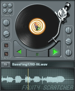 Fruity Scratcher это симулятор винилового проигрывателя. Вы можете загрузить в этот плагин любой сэмпл, который поддерживается FL Studio, чтобы записать свое исполнение в режиме реального времени. Вы также можете настроить ускорение проигрывателя (массу), чтобы это удовлетворяло вашим потребностям. Два тесно связанных, но более сложные плагина это инструмент WaveTraveller и эффект Gross Beat. Однако заметим, что WaveTraveller это генератор, а не эффект и, таким образом, должен быть загружен в пошаговый секвенсор.