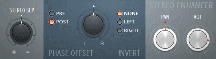 • Переключатель Pre/Post (перед/после) - позволяет выбрать, как будет применено STEREO SEP перед (PRE) или после (POST) других фильтров этого плагина.