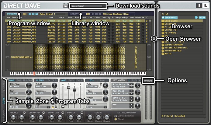 • Верхний интерфейс - верхняя часть содержит вкладку Program, которая позволяет распределить сэмплы по всей клавиатуре и наслаивать по велосити. Вкладка Library показывает программы, которые доступны из вашей библиотеки DirectWave.