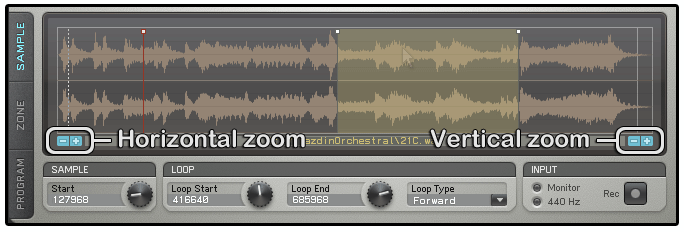 - Zoom (масштабирование) - щёлкните правой кнопкой по полосе прокрутки/пути сэмпла (ниже окна сэмпла) и перетащите вверх/вниз.