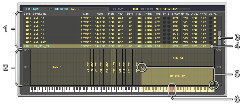 2. Zone Mapper (зона назначения) - позволяет пользователю назначать сэмплы на пространства клавиши и велосити.