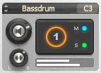 • Включение независимого выхода пэда - нажмите на окно названия пэда (показано внизу слева) и выберите смещение из раскрывающегося списка. Число смещения треков микшера основной программы, в списке Master.
