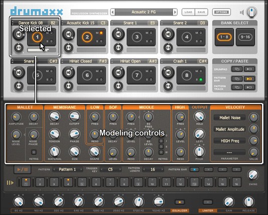 Drumaxx моделирует ударные инструменты давая вам полный контроль над более чем 16 моделируемыми инструментами, которые могут быть направлены на независимые выходы для внешней обработки эффектами.