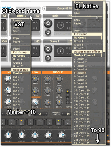 В примере слева, раскрывающееся меню отображаемое для VST (второй пэд) и справа для родного FL Studio (четвёртый пэд).