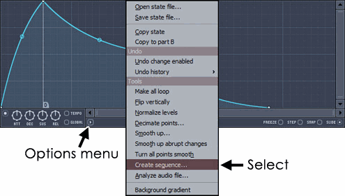 Нажмите по меню опций огибающей (маленькая стрелка вправо на стандартных огибающих), а затем выберите Create sequence (создать секвенцию).