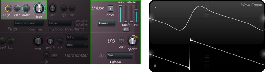 Как это сделано: Параметр количества голосов order в Unison этого патча установлен в значение 2, это создаёт два голоса для каждой ноты. Здесь тонкие изменения голосов, создают интересный эффект унисона. В Unison параметр pan разделяет голоса унисона в стерео поле, но регулятор pan вызывает не только эффект панорамирования в максимальные положения панорамы. Обратите внимание на включенное lfo в разделе фильтра, и раздел LFO установленный в форму синусоиды. LFO вызывает циклические изменения в высокочастотных составляющих двух голосов унисона, также параметр var в унисоне добавляет индивидуальное смещение начала LFO каждому голосу. Таким образом эти циклические и различные потери высоких частот в двух голосах унисона, вызывают слышимый сдвиг в положении нот. Вы можете видеть на правой картинке выше левый канал гладкий, а правый имеет форму пилы (содержит больше высокочастотных гармоник) и в следствии этого кажется, что панорама сдвигается вправо.