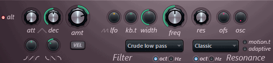 • alt (альтернатива) - альтернативный режим «адаптивной огибающей» обеспечивает модуляцию частоты среза фильтра только в диапазоне от текущего значения среза до максимального/минимального предела частоты. Диапазон модуляции среза "адаптивный" в том, что всегда модулируется 100% огибающей = максимальная/минимальная частота. Направление зависит от значения amt, которое может быть положительным или отрицательным. Цель состоит в том, чтобы избежать "паузы", которая может произойти в «нормальном» режиме, когда частота среза модулируется выше или ниже максимальной/минимальной частота среза создавая паузы при пересечении пределов, пока значение модуляции возвращается в пределы слышимого диапазона.