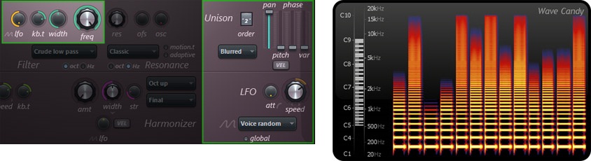 Как это сделано: В разделе LFO установлен режим Voice random, который выбирает новое случайное значение для каждой новой сыгранной ноты и был выключен режим global, это позволяет случайному значению LFO быть разными для всех голосов. Параметр pan в Unison производит разделение позиций панорамирования копий голоса, это не то же самое что обычное панорамирование. Параметр pan влияет только на максимально возможное положение панорамы в этом патче. Панорамирование вызывается lfo в разделе фильтра, с помощью установки случайного значения среза freq для каждой воспроизводимой ноты, как показано на спектрограмме (показано 13 нот). Это приводит к тому, что верхняя частота среза для каждого голоса унисона отличаются, и это вызывает слышимый сдвиг положения нот.