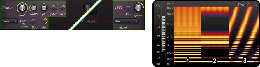 Как это сделано: Фэйзер в Harmless моделируется гармонической "маской", по существу, шаблоном вырезов гармоник, который удаляет несколько групп гармоник. На графике спектра (1) показан исходный звук до эффекта фазера. Это было достигнуто путём поворота регулятора amt до минимума. (2) показывает статическую гармоническую маску (без движения). Это было достигнуто путём поворота регулятора lfo связанного с ofs на минимуму (12 часов). (3) показывает оригинльный патч LFO on phaser. LFO изменяет маску (фэйзер) смещением ofs. Смещение просто контролирует, где в спектре частот появляются вырезы полос.
