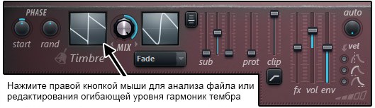 По умолчанию, Timbre 1 и Timbre 2 генерируют волну пилы и прямоугольника соответственно. Смешивание тембров создаёт промежуточные превращения между ними. Вы можете щёлкнуть правой кнопкой по окнам Timbre (тембр) для загрузки звуковых файлов, перетащить звуковые файлы на окна или изменить назначенные гармоники тембра (уровень и фазу), что позволяет создавать пользовательские сигналы. Выход из раздела тембра комбинируется с разделом изображения/ресинтеза (если активно).