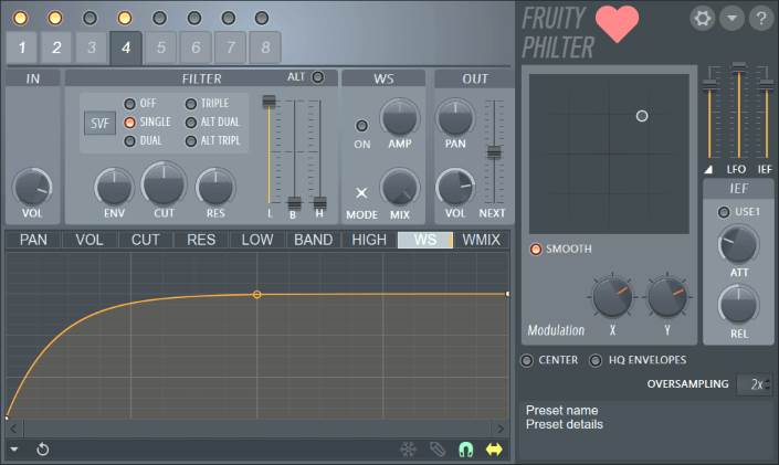 Fruity Love Philter это самый мощный плагин фильтр в FL Studio. Love Philter состоит из восьми одинаковых блоков фильтров, каждый из которых способен работать параллельно или в серии, отправляя выход блока фильтра к следующему в цепочке. Love Philter может создать сложную задержку, гейтирование и эффекты фильтрации. Связанные, более простые плагины фильтров это Fruity Filter и Fruity Free Filter.