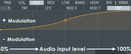 Понимание IEF - думайте о окне IEF как о пиковом/дБ измерителе повёрнутом на бок, увеличивающимя в уровне слева направо (на это указывают возрастающие вертикальные пометки вдоль нижней части окна IEF). Потому как пиковый уровень входящего сигнала перемещается через окно (кстати, нет визуальной обратной связи), IEF возвращает значений модуляции, так что огибающие выше средней линии области графика положительны, а огибающие ниже средней линии отрицательны.