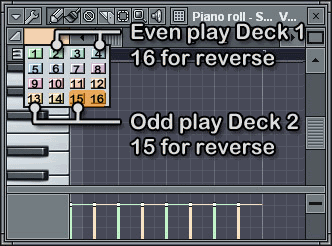 Цветные ноты в Piano roll могут использоваться для независимого управления деками А и В. Как показано ниже, ноты чётных цветов используются для управления декой А, а ноты нечётных цветов – декой В. Ноты цвета 15 и 16 используются для реверсивного воспроизведения. Помните, что цвет ноты соответствует MIDI каналам от 1 до 16, поэтому, Вы можете управлять воспроизведением через должным образом настроенный MIDI контроллер.