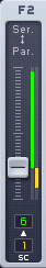 Фейдеры в Massive назначаются таким же образом, как и ручки. Некоторые из фейдеров (такие как фейдер входа на шину фильтров, с надписью "Ser > Par" на интерфейсе) может принимать источники модуляции таким же образом, как и ручки, и имеет те же маленькие поля возле них, которые служат в качестве слотов модуляции. После выполнения назначений и их перетаскивания вверх или вниз, для установки диапазона модуляции, вы увидите цветные линии вдоль боковой части фейдера, которые указывают диапазон, который вы установили, как на этой картинке: