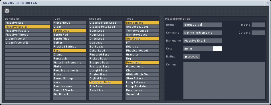 Вы можете получить доступ к окну атрибутов, нажав на кнопку Attributes в панели управления синтезатором. Его схема аналогична окну базы данных в браузере, но из окна браузера вы загружаете KoreSound, а в окне атрибутов сохраните их. Таким образом, результаты поиска не нужны и заменяются на мета-информацию.