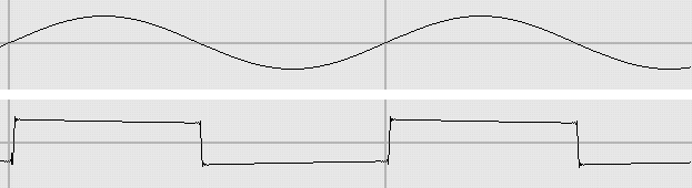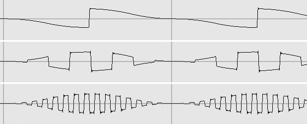 Доступны несколько различных режимов в их числе Spectrum, Formant и три Bend режима. По умолчанию выбрано Spectrum. В этом режиме параметр Intensity уменьшает более высокочастотные гармоники выбранной формы сигнала. Эта функция такая же, как среза высоких частот в фильтре, хотя алгоритм отличается от стандартной конструкции фильтра. Это проиллюстрировано ниже: верхнее изображение отображается волну при минимальном значении Intensity; нижнее имеет максимальное значение. Как вы можете видеть, при повороте значения Intensity вниз, квадратная волна постепенно становится синусоидой, т.е. остаётся только фундаментальная синусоида.