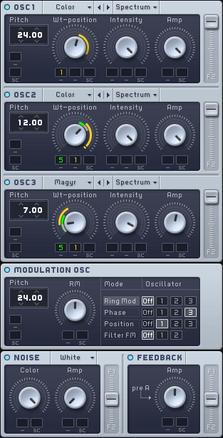 Генерация звука в Massive начинается из раздела осцилляторов, который можно найти на левой части интерфейса. Он включает в себя три осциллятора волновых таблиц, модуляционный осциллятор, который может быть использован для модуляции любого или всех из этих осцилляторов волновых таблиц, генератора шума и раздела обратной связи.