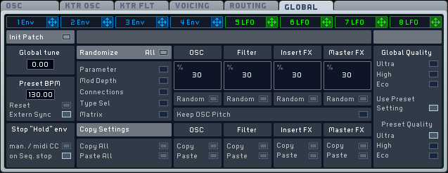 Страница Global содержит различные параметры, которые важны для всех других частей Massive, например параметр глобальной настройки. Эта страница также обеспечивает некоторые возможности копирования и вставки, а также возможность случайностей в настройке текущего звука.