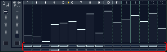- Параметр Glide настраивает скольжение модуляции между предыдущим шагом и текущим. Скольжение может быть использовано для создания мягких переходов между шагами. Когда этот параметр находится в полностью нижнем положении, нет скольжения между шагами; при перемещении полностью в верх, скольжение имеет максимум. Следует отметить, что эта функциональность должна быть активирована для каждого шага отдельно с помощью строки активации скольжения шагов, ниже, первая строка под столбцами.