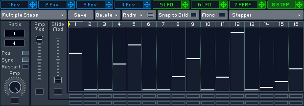 Stepper в основе это пошаговый секвенсор. Он позволяет определить определённое количество шагов, каждый из которых имеет определённое значение амплитуды. Шаги читаются в зацикленной последовательности, воссоздавая периодический сигнал, который будет использоваться в качестве модуляции.