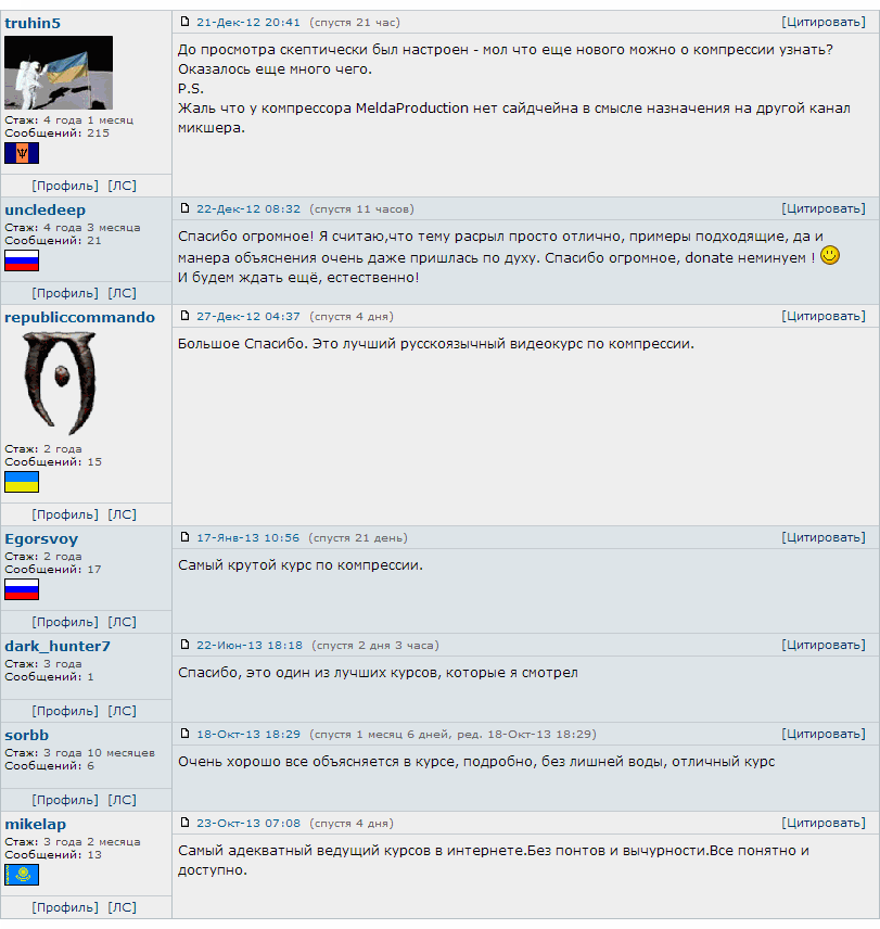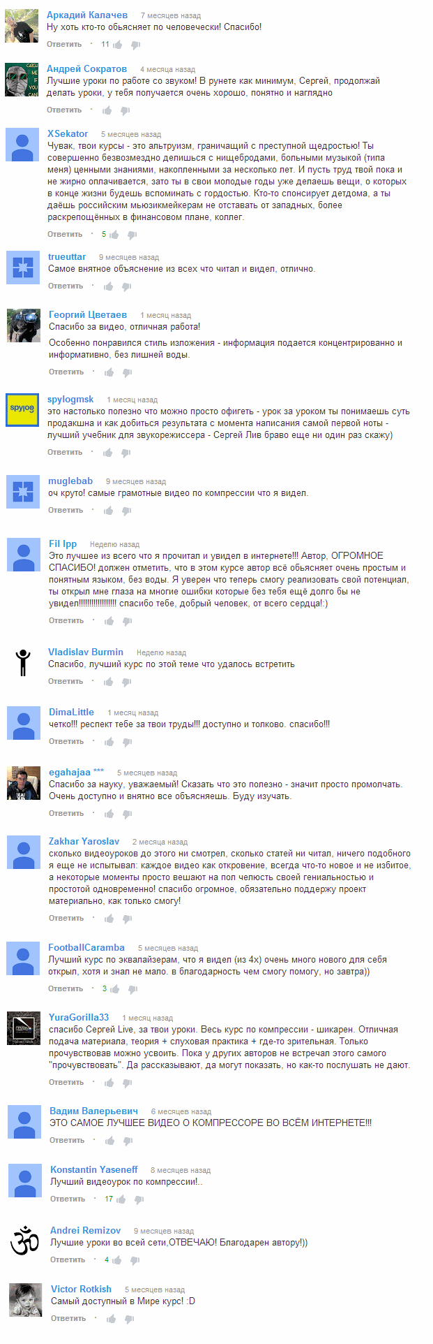 01 Что такое компрессор звука и как он работает 02 Принцип работы звукового компрессора 03 Принцип работы параметров компрессора 04 Техника настройки компрессора 05 Групповая компрессия 06 Сайдчейн компрессия 07 Параллельная компрессия 08 Многополосная компрессия 09 Компрессия в электронной музыке 10 Как лучше воспринимать компрессию 11 Серийная компрессия 12 Реверсивная компрессия 13 Гейт 14 Экспандер 15 Деэссер 16 Транзиентшейпер 17 Лимитер |