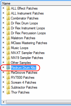 Это папка в которой содержатся различные звуки (патчи, в других параграммах называются пресетами), список банков можно пополнять но об этом далее. После выбора банка в другой части окна найдите папку Redrum Drum Kits (см. рис. ниже):
