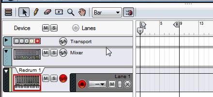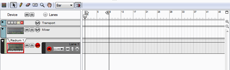 Для того чтобы приступить к созданию бита необходимо добавить мидиклип. Для этого выберите иконку карандаша и нажатием левой кнопкой мыши по дорожке Redrum1 ведите в сторону (см. рис. ниже):