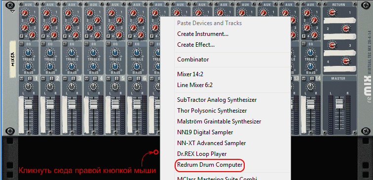 Прежде чем приступить к созданию бита или мелодии необходимо сначала добавить инструмент. Начнём к примеру с бита, для этого добавим новый инструмент Redrum Drum Computer, коснёмся данного инструмента совсем немного более подробно о данном инструменте читайте в статье про него. Для того чтобы добавить инструмент в ваш проект кликните по пустому месту в рэк стойке и выберите в списке Redrum Drum Computer (см. рис. ниже):