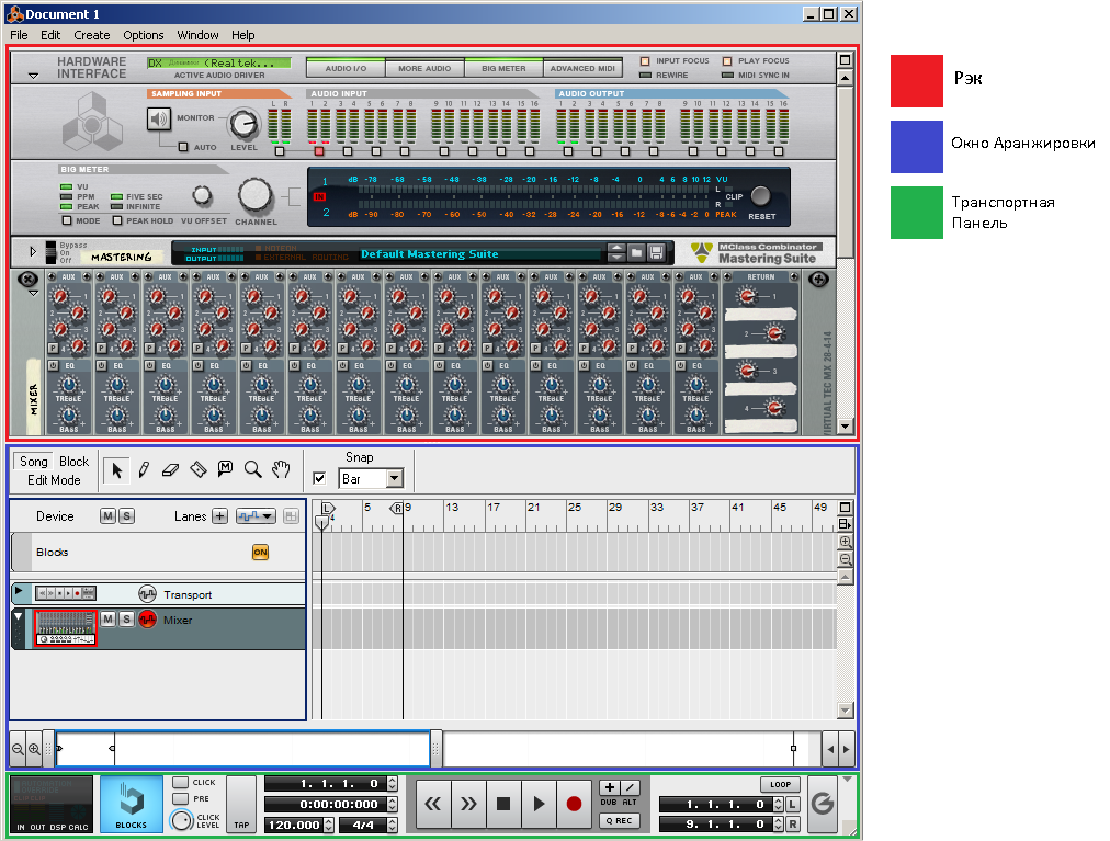 Красная часть этого окна называется рэк стойка. Синяя часть называется секвенсором, а зеленая навигационной панелью. В Reason есть несколько демонстративных проектов показывающих возможность программы. Если вы хотите их прослушать то нажмите File => Open, выберите папку (слева) Reason Folder, далее (справа) папку Demo Songs в ней они и находятся.