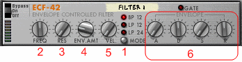 - ADSR - стандартный генератор огибающей ADSR (см. статью). Огибающая запускается с помощью сигнала, подключаемого ко входу ECF-42 на задней панели, или с помощью MIDI нот на секвенсорной дорожке, подключенной к ECF-42.