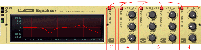Отдельные полосы отделены вертикальной полосой на панели, и следуют в следующем порядке (слева направо): lo cut/Lo Shelf/Parametric 1/Parametric 2/Hi Shelf. Активация отдельных полос производится нажатием на кнопку в верхней части каждой полосы (по умолчанию все полосы выключены).